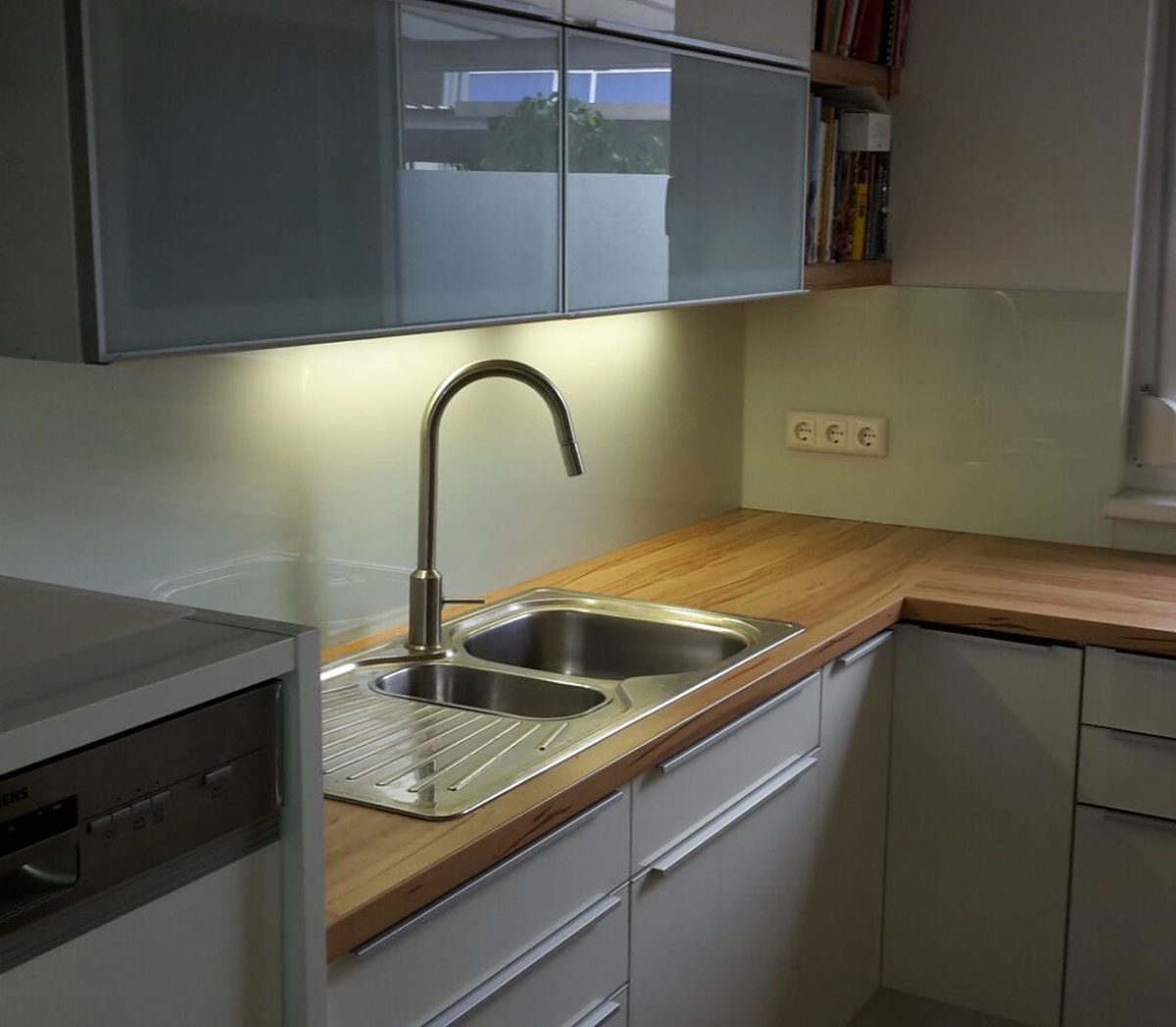 Eine Küchenrückwand aus Glas sieht prachtvoll aus, doch sie ist auch leicht zu reinigen und zu pflegen. Denn eine Glasfläche weist naturgemäß keine Fugen auf. Selbst wenn die Rückwand um die Ecke geht, gibt es nur einen einzigen Übergang, den wir sorgsam ausführen. Daher können sich auch in Fugen keine Schmutzpartikel sammeln, die schwer oder gar nicht mehr weggehen. Eine Fläche aus hochwertigem Glas bleibt lange glatt und lässt sich entsprechend einfach reinigen. Schmutz haftet nicht gut und geht mit den passenden Pflegemitteln schnell wieder weg. Wir beraten Sie gerne zur optimalen Pflege für Küchenrückwände. Mauerhofer ist Ihr zuverlässiger Partner für Glas.